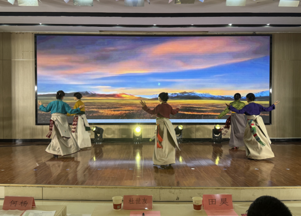在文艺展示环节,我校采矿2407班王宇婷同学演唱了深情婉转的歌曲《大山》,展现了能源学子的家国情怀。西藏阿里班学生表演了富有民族特色的藏族舞蹈,表达了民族团结的真挚情感。两名在校学生代表分享了观看九三阅兵后的感悟,表示要以阅兵精神为动力,刻苦学习、锤炼本领。