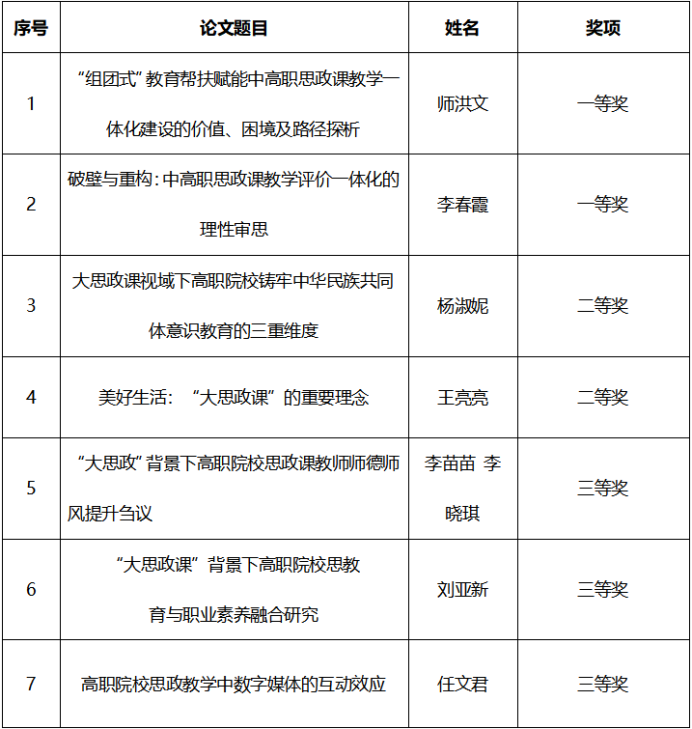 此次获奖论文内容聚焦“大思政课”改革创新的核心议题,涵盖课程建设、教学方法、实践路径等多个维度,这些研究成果不仅体现了学校在“大思政课”建设领域的多元化科研布局,也反映了我校思政课教师在理论研究和课程建设方面的积极投入。