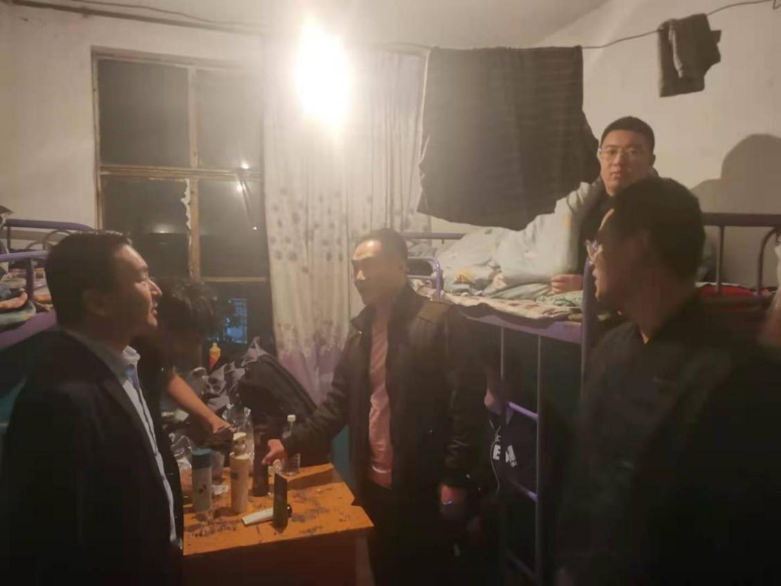 会后,李鹏、陈建、李晨阳到各个宿舍看望学生,和同学们谈心。李鹏耐心询问了同学们在矿区宿舍生活中有没有困难,并逐个给予帮助解决,并且嘱咐同学们要注意开窗透气、整理好宿舍内务、确保用电安全、做到人走断电,注意各项安全。