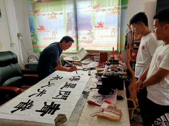 作为国家一级书法家,同新功写得一手好字。最后,实践队员们前往同新功老师家中欣赏其书法作品。纵观他的书法作品使人感到雄浑古朴、大气磅礴。临别,同新功现场挥毫泼墨,书写暑期社会实践队名“青春闪光 星火传承”赠予团队。