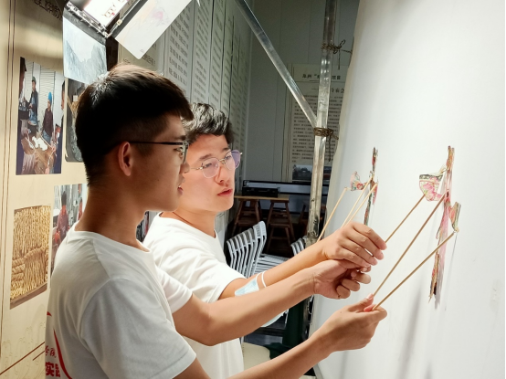 图为实践队员体验皮影戏表演