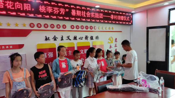 暑假实践活动成员为小学生代表发放慰问品