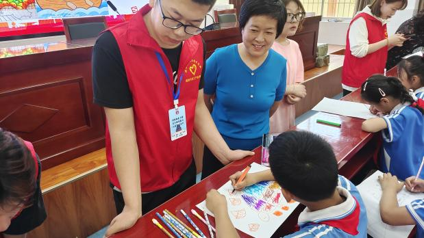 活动开始,志愿者们发放作画工具,并引导同学们大胆勾勒、以手绘心,用一支支五彩斑斓的画笔创作心中“党的红色印记”,他们用奇思妙想构思出了美妙的世界。每一幅作品都独具风格,有的构图大胆,对比鲜明;有的活泼可爱,色彩明丽;有的画风时尚,柔韧有余,展现出小画家细腻的心思与大胆的想象,表达了他们对绘画艺术的热爱之情以及对党、对祖国的热爱与对未来的畅想。