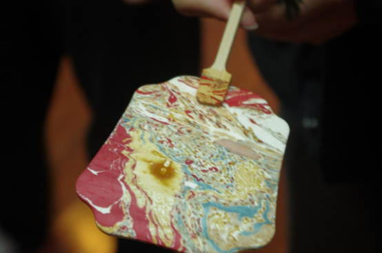 飘漆是利用漆不溶于水的特质,以点、甩、弹、划等手法,在水面绘出图案效果,以扇子为载体,通过漂流漆技法,这样制作出的扇面,都是独一无二的。