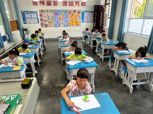 在实践队员的引导下,孩子们拿起七彩画笔,在纯白的画纸上自由挥洒想象力,将缤纷的颜料涂抹在纸上,充分展示对世界的纯真观察与无限畅想。之后,实践队员们为孩子们陆续开展了体育、书法、音乐等课程的基本知识讲授与初探,为后续丰富多彩的暑期课程奠定了温暖而充满活力的基础。