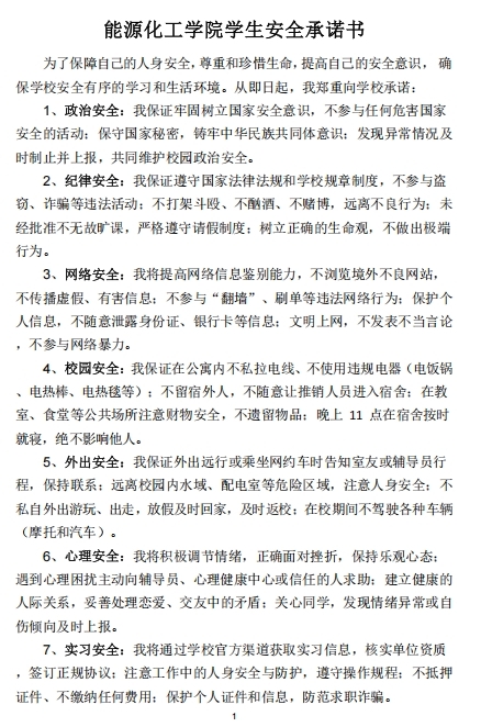 宿舍排查后,学院先强化安全教育以“场景化 + 清单化”推进,辅导员查宿时现场讲案例,帮学生直观认风险,再组织签署《能源化工学院学生安全承诺书》和《班干部履职承诺与知情同意书》:教育承诺书含政治安全、纪律安全等 10 个维度,明确责任,1700 余名学生全员签署,部分班级还开展 “安全承诺宣誓” 强化意识。