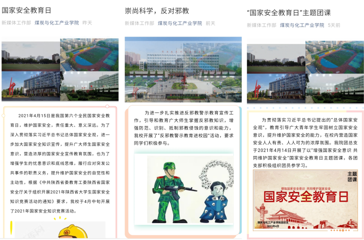 活动期间,煤化产业学院积极利用多种教育形式,通过开展主题团课、组织学生观看“千万师生同上一堂国家安全教育课”、“微博#国家安全日#话题”互动、国家安全知识竞赛活动线上答题和学院官微推送宣传等丰富多彩的途径,深入开展宪法和国家安全法、反恐怖主义法、网络安全法、公共卫生安全等法律法规的学习宣传教育。