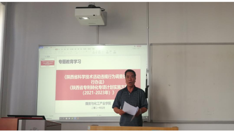 会上,李志带领学院全体教师学习《陕西省科学技术活动违规行为调查处理暂行办法的通知》(陕科发〔20213号)、《陕西省专利转化专项计划实施方案(2021-2023年)的通知》。重点解读了规定中关于科学技术人员的违规行为,以及对违规行为处理措施,强调在科研工作中教师要杜绝学术作假、夸大研究价值、“托关系”等违规行为,诚信做科研。以学院凌洁副教授两项专利成果成功转化的案例,鼓励教师科研以成果转化为导向,加强专利申请前评估,切实提升专利质量,促进成果转化。