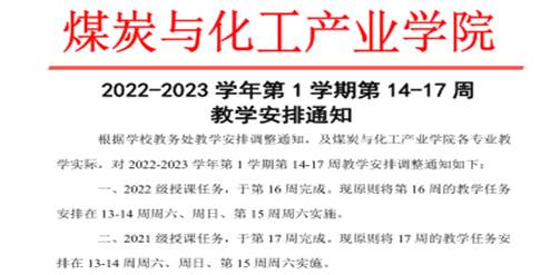 1. 煤炭与化工产业学院根据学校防疫要求及教务处教学安排的通知,积极组织学院教学安排,建立以教研室为单元的教学调整计划,不搞一刀切,一个专业一个安排,减少学院干预,少出文件,实现“专业教学回归专业”,多项文件合并,实现少出文件保教学质量质量;