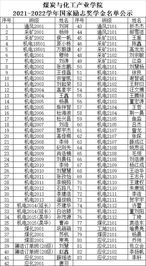 通过班级民主评议、学工会议及学院党政联席会议综合评定,学院最终决定推荐83名学生上报学校参与国家励志奖学金的评审(附名单)。现对煤炭与化工产业学院2021-2022学年国家励志奖学金名单进行公示,公示日期为2022年10月26日一2022年11月1日,如有异议请在公示期内来我院学工办公室(培训楼409)进行反映。