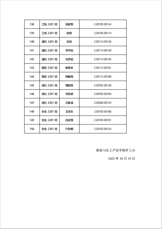 按照学校工作安排,已开展我院 2022-2023学年年度三好学生、优秀学生干部、先进班集体评优前期工作,评优工作严格按照《陕西能源职业技术学院三好学生、优秀学生干部、先进班集体评选办法(暂行)》(陕能院学〔2017〕16 号)有关规定执行,评选条件、评选比例、评选程序坚持公平公正公开。现就评选结果进行公示,此公示名单为煤化学院拟公示名单,最终名单需要等学校的最终公示。公示期3天(2023年10月10日至10月12日),如有异议,请及时向学工办反映。