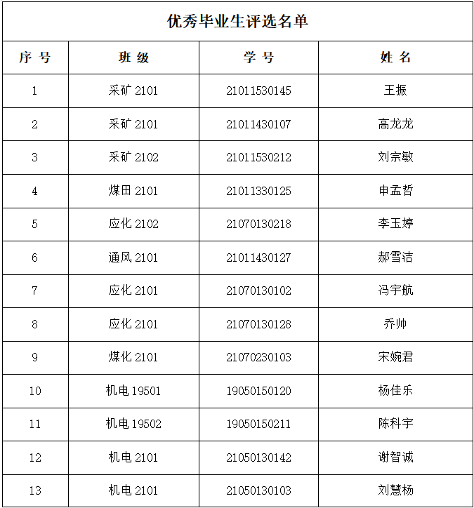 根据学校《陕西能源职业技术学院优秀毕业生评选办法》,我院2024届优秀毕业生评选工作在学院评审工作小组领导下,严格评审程序,坚持公正、公平、公开原则,按照“个人申报-班级民主评议-学院审核 ”等程序,已评出2024届学院优秀毕业生27人,名单公示如下: