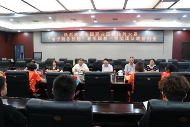 朱忠军代表学校祝贺“电子商务技能”团队以全国第一的名次获得“一等奖”。对各位获奖选手和指导教师表示感谢,指出,“电子商务技能”赛项团队取得如此优异的成绩是多年努力的结果,旗开得胜,为今年技能大赛国赛开了好头。