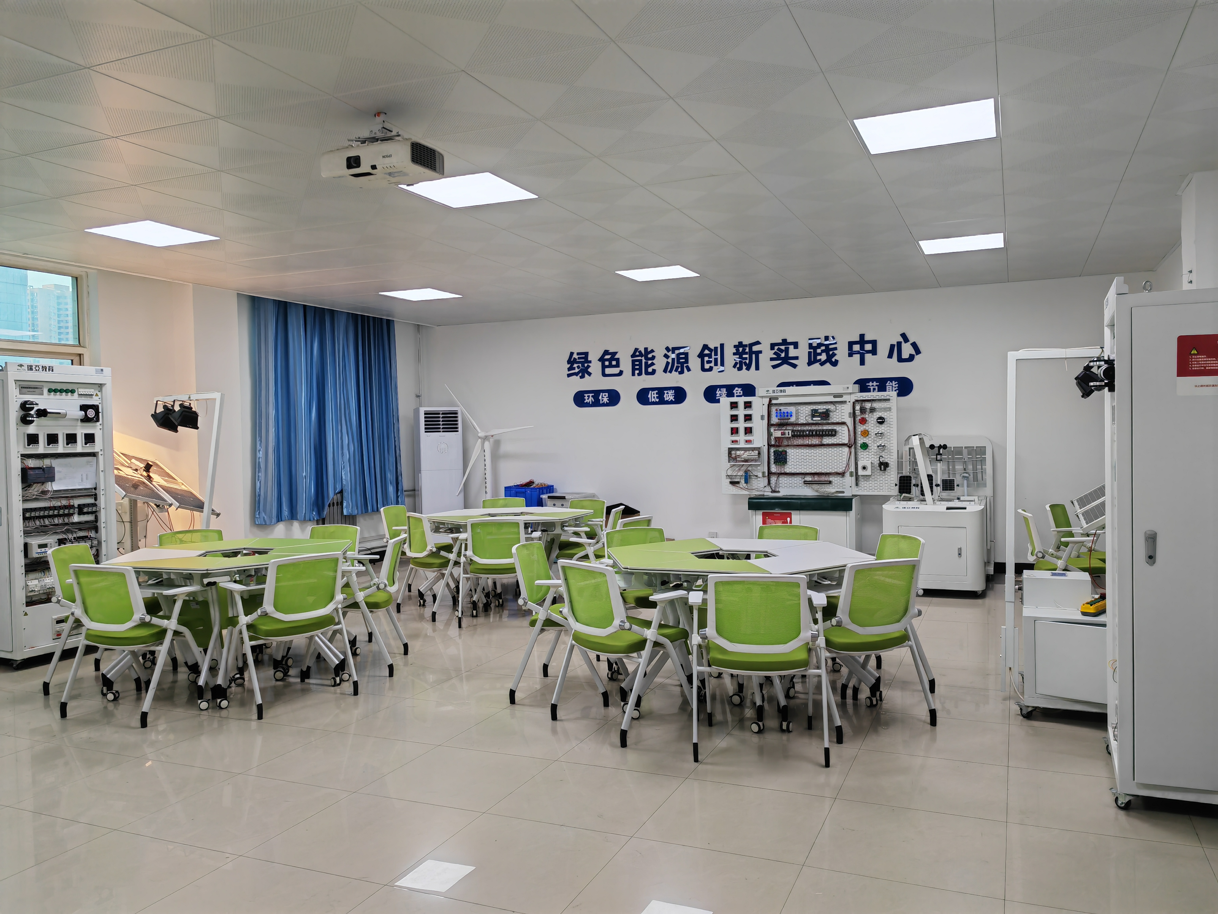 绿色能源创新实践中心是集教学、实训、科研于一体的新能源装备系统实训平台,主要面向新能源装备技术、电气自动化技术、储能技术等新能源相关专业。中心现有3套新能源装备系统,分别是1套风光互补电力系统和2套光伏发电系统。这三套实训系统均能用于新能源发电系统研发、设计、制造、装配、调试和维修等实操,同时配套使用智能发电系统设计软件和智能配电规划软件,可实现“源、网、荷、储”全系统的实操,使得教师能够将教学环境与现场工作环境相结合,学生能够将理论知识与实际操作相结合,兼具教师教学能力提升和学生综合职业能力的双重功效,从而为新能源相关专业的发展和新能源产业的发展提供强力支撑。