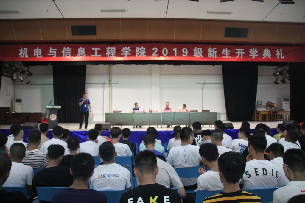 8月30日上午10:00,机信学院2019级新生开学典礼在菊园四楼大学生活动中心隆重召开。机信学院院长李志、副院长刘涛、综合办主任张继军、学工办主任冯帅、全体辅导员及新生班主任与1014名新同学一起参加了本次开学典礼。开学典礼由刘涛副院长主持。