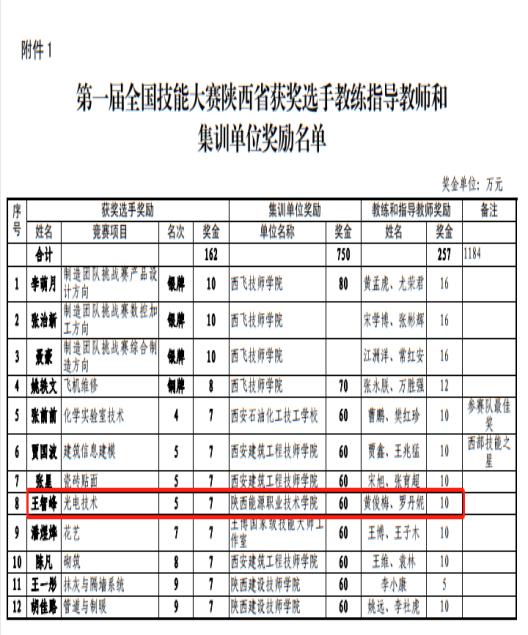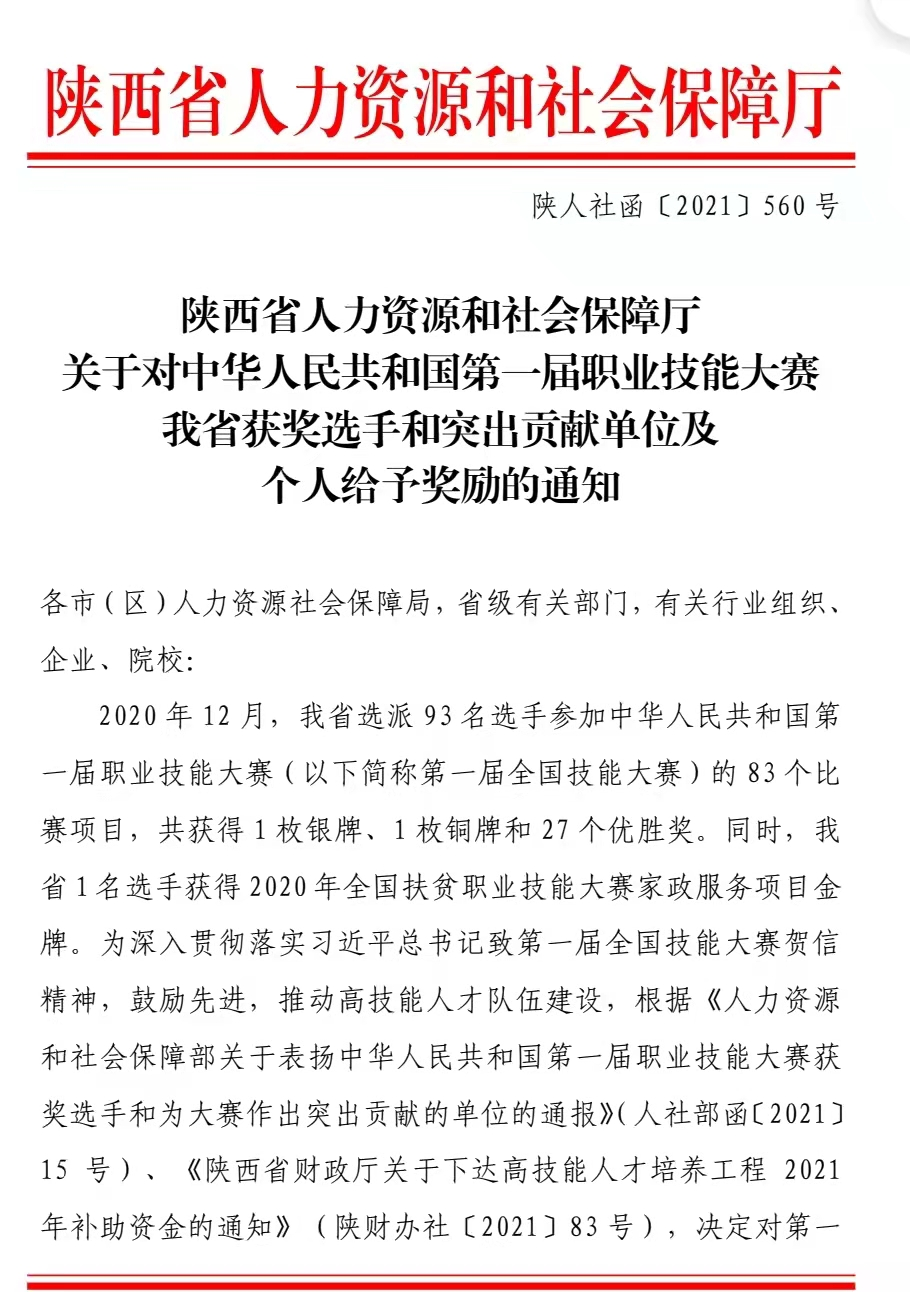 根据陕人社函〔2021〕560 号 《陕西省人力资源和社会保障厅关于对中华人民共和国第一届职业技能大赛 我省获奖选手和突出贡献单位及个人给予奖励的通知》精神,智信学院王智峰同学在第一届全国技能大赛“光电技术”赛项中获得全国第五名,成功入围世赛项目国家集训队,并获得奖励7万元,我校获“做出突出贡献单位”奖励60万元、黄俊梅、罗丹妮老师获指导教师奖励10万元。