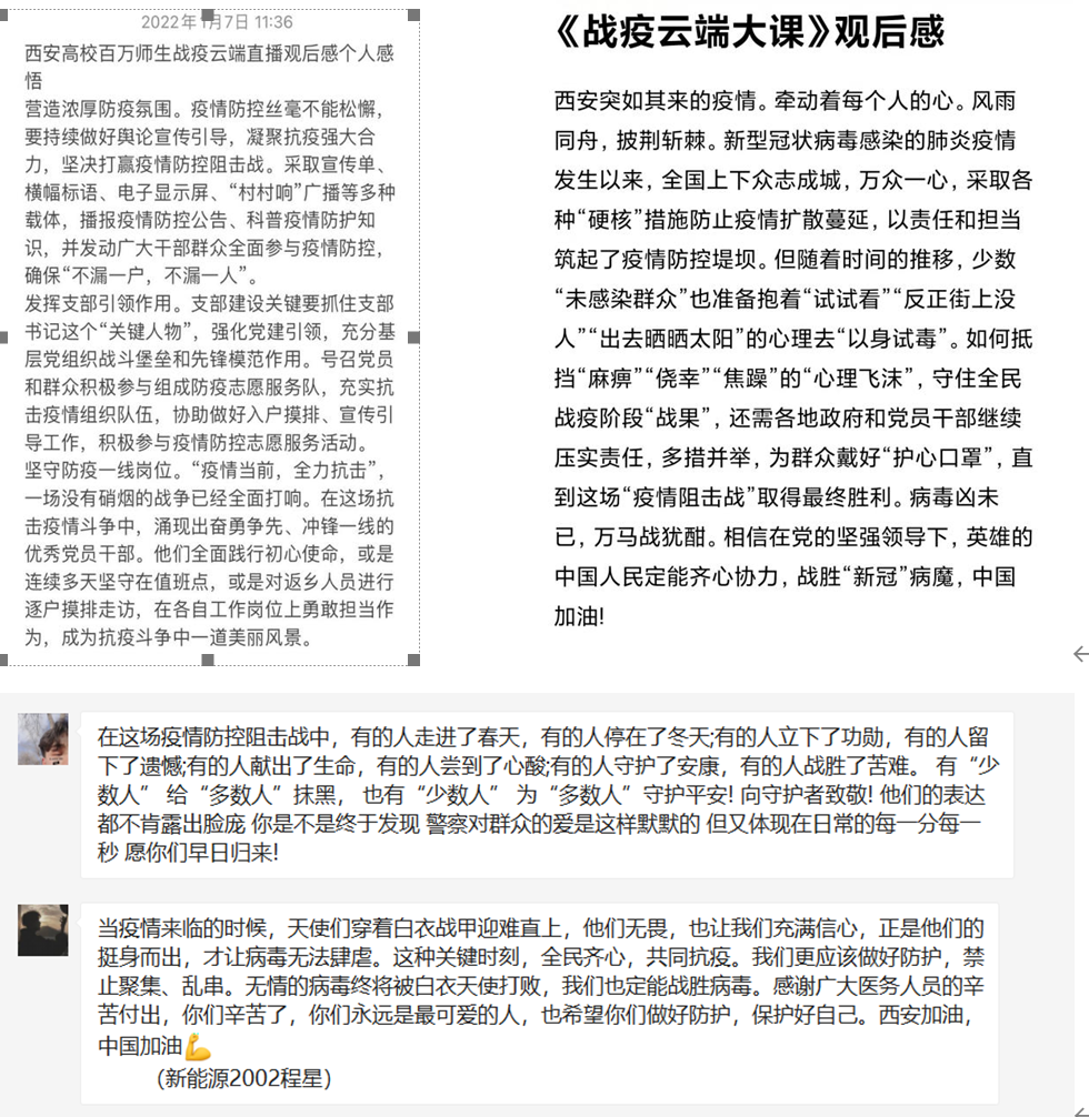此次战役云端大课通过讲述了学生志愿者代表参加西安志愿者抗疫情服务的故事,他们也是普普通通的学生,为我们分享了学生们在疫情期间如何学习、生活,以及辅导员老师讲述抗疫一线的故事。同学们通过各种各样的方式进行观看。