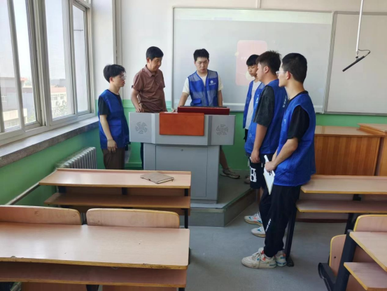 同学们对多媒体设备进行全面检测和清理,确保设备的正常运行,清洁教室白板,统计桌椅数目,保证教室课桌数和上课学生数匹配准确。