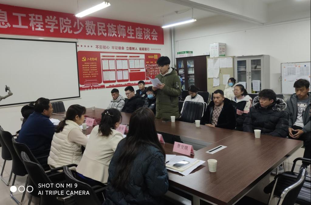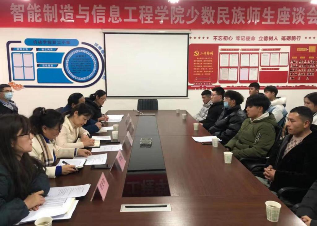 为进一步关心少数民族学生的学习、生活,倾听他们的心声,不断强化学院管理育人、服务育人的针对性与实效性,引导少数民族大学生健康成长成才,12月31日下午16:30,智信学院在办公楼509会议室召开智信学院少数民族学生师生座谈会。智信学院党总支书记曹俊侠、副书记李粒、学工办主任景安琪、全体辅导员及智信学院11名在校少数民族学生参会。另外,我院特邀学生处新疆驻内地教师卢德华参会,会议由党总支副书记李粒主持。