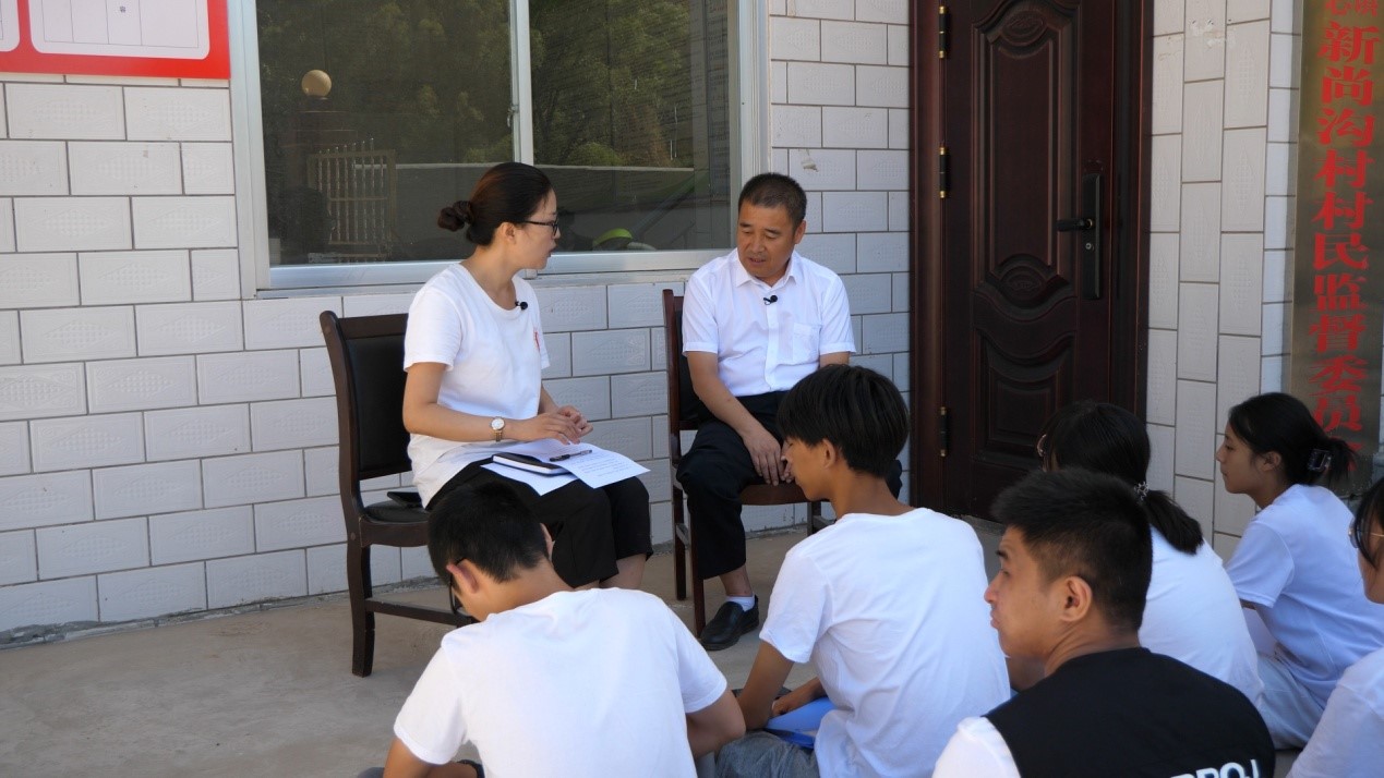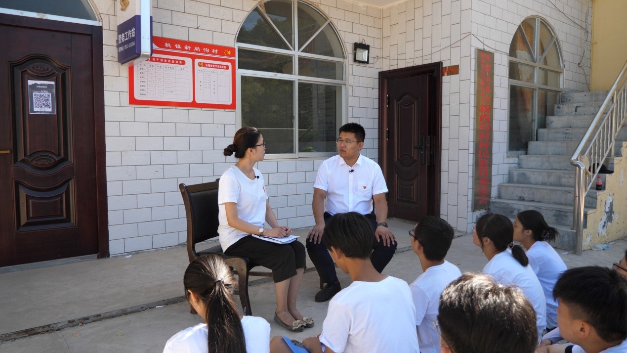 仪式正式举行前,暑期社会实践团还分别对新尚沟村第一驻村书记乔喜军及新尚沟村村支书、米森农业发展有限公司负责人、优秀校友任宏宇进行了专访。访谈中,乔喜军详细介绍了新尚沟村的情况、分享了作为第一驻村书记到任后新尚沟村发生的变化,特别是作为国家级贫困村的脱贫成果,并对新尚沟村实现乡村振兴进行了规划。谈及自己选择续任时,乔书记讲到自己已经熟悉并热爱这个村子和村民,接下来工作中,想继续切实为群众办实事,解决群众的实际困难。任宏宇作为校友,分享了自己在校期间的学习和生活经历,谈到了学生干部及参加实践活动的经历给自己发展带来的帮助,结合自己的创业经历告诫实践队队员基层充满机遇,农村大有可为。通过本次访谈,同学们进一步了解了村上的基本情况,感受到了他们认真负责的工作态度,对今后的学习、工作有了更清晰的认识。