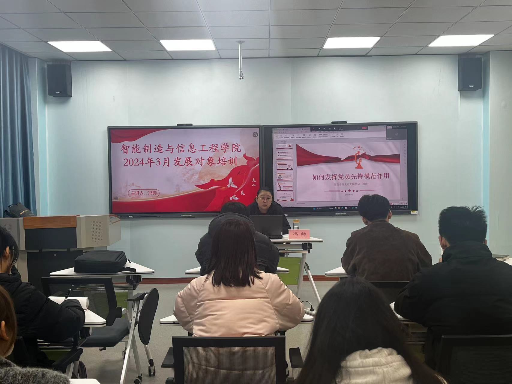 为进一步提升党员发展对象的政治觉悟和理论水平,扎实推进发展对象培训工作,鼓舞青年同志凝心聚力、不断奋进,2024年3月5日晚7:30,智信学院党总支副书记冯帅在教学楼509为发展对象讲授以如何发挥党员先锋模范作用为主题的党课。