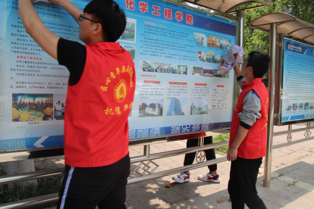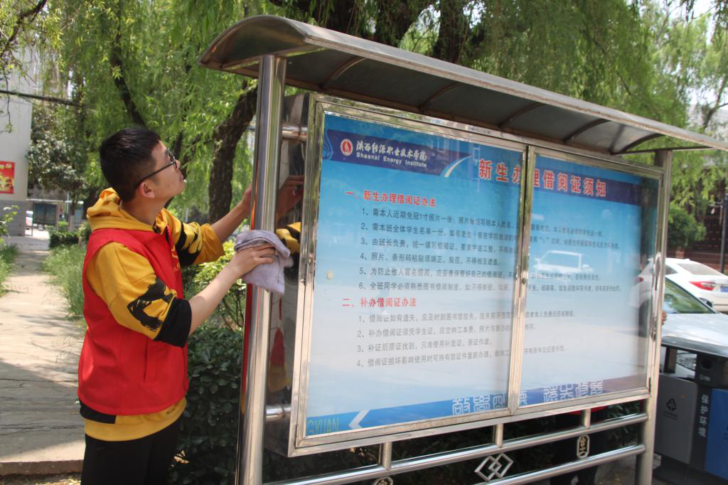 2019年4月19日中午,机电1801、1802及机电1808班学生积极响应校学工部“清明时节话感恩”活动,对校园办公楼、实训楼、图书馆及公寓楼的报刊栏进行了清洁。