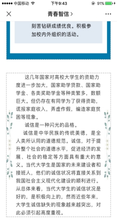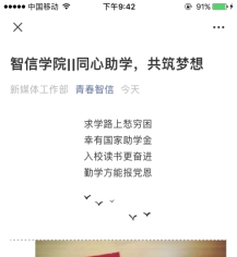 智信学院通过宣传板报、微信平台推送等方式对国家资助政策和学校资助政策进行宣传,包括国家奖助学金、国家生源地信用助学贷款、校内奖学金等。让智信学院的每一位学子都能了解和认识到国家对家庭困难大学生的一系列资助政策,促使我校学子在以后的学习、生活中能以自己的实际行动报效祖国,回报社会。