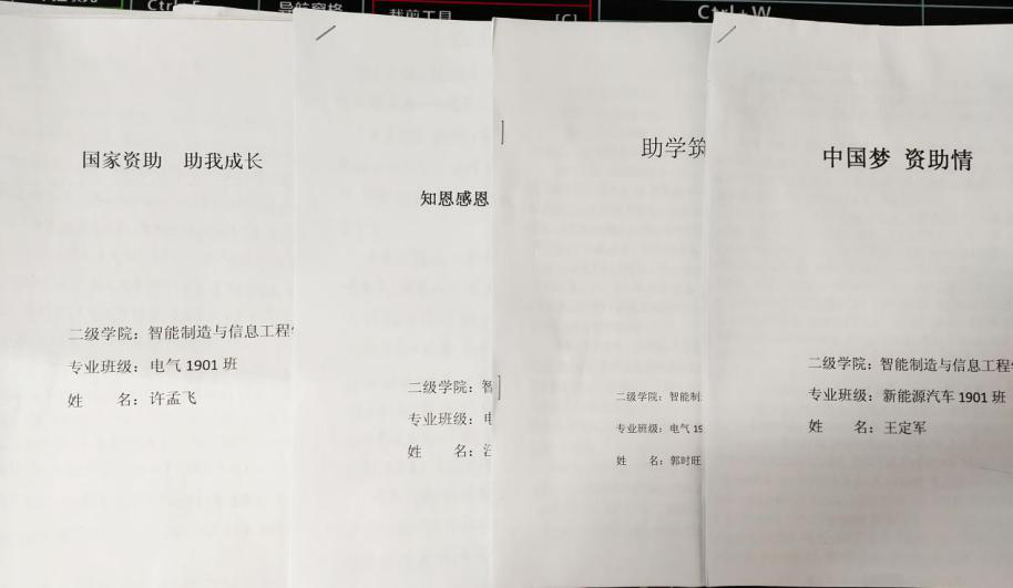 首先,针对2019级学生开展以“自强、感恩、成才”为主题的“中国梦·资助情”征文比赛。广泛引导受助学生把个人梦想与民族的共同理想紧密结合起来,心怀大爱、积极投身中国特色社会主义事业的伟大实践。活动通知一经发出,学生积极投稿,共收集了85份征文,经二级学院领导及学工办辅导员集体评选,最终评选出新能源1901班王定军获一等奖;电气1901郭时旺、电气1901王振东获二等奖;新能源1901罗昭杰、电气1901许孟飞、电气1902汪文华获三等奖;物联网1901张凡、网络1903牛欢欢、新能源1901陈旭东、网络1901裴雪获优秀奖;电气2002刘勇获鼓励奖。