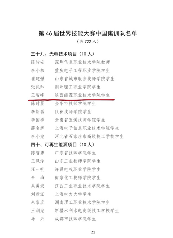 在近期公布的最终名单中,根据中华人民共和国第一届职业技能大赛世赛选拔项目选手比赛成绩,确定包括王智峰等642人入围第46届世界技能大赛中国集训队。