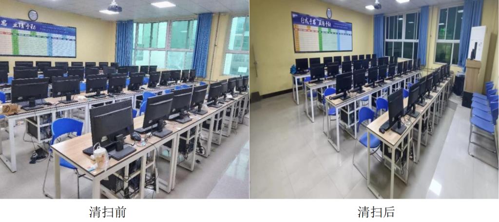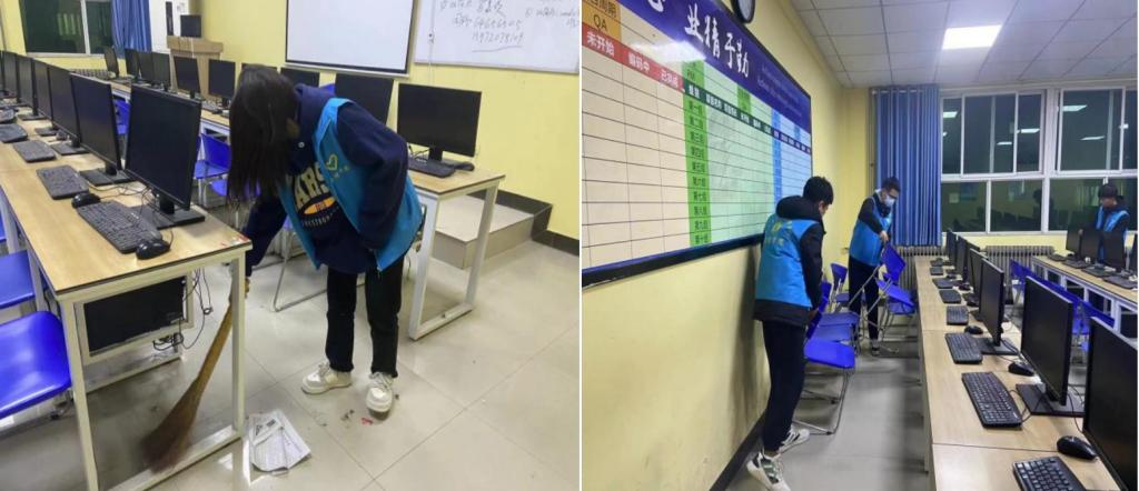 清扫过程中,志愿者们明确分工、相互配合,不怕脏、不怕累,齐心协力对教室的各个死角进行了细致的清理,并对桌面、椅子,讲台进行了彻底的清洁,致力于为同学们创造舒适的学习环境。