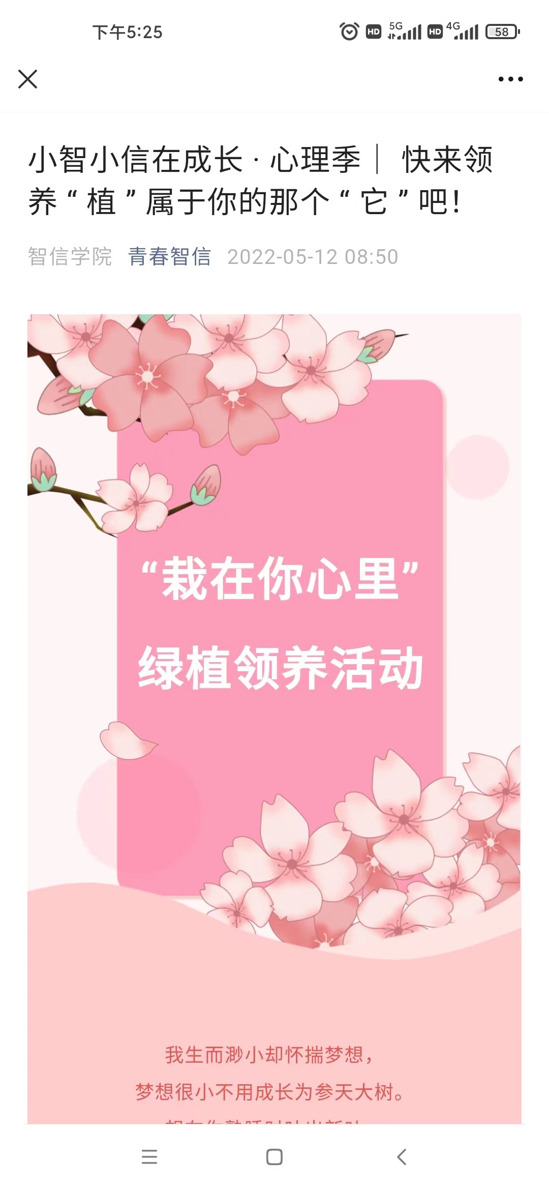 为迎接“5·25全国大学生心理健康日”的到来,提高大学生关爱心灵、呵护生命的意识,5月13日,由心理健康教育中心主办,智信学院承办的第七届“栽在你心里 让生命绽放”绿植领养活动如期开展。