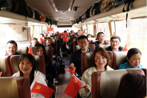 在前往延安路途中,党员们通过快板、诗朗诵、唱红歌等方式表演了精心准备的节目,分享大家学习党史的心得体会,展现了党员教师风采。