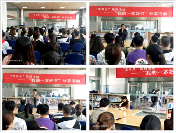 首先由图书馆馆长师培杰为本次活动致辞并进行好书分享:他指出图书馆的工作是为大家服务的,以后图书馆会在临潼校区举办更多相关活动;他和大家分享了图书《知行合一——王阳明》(习近平总书记在讲话中多次强调“知行合一”),重点分享了杨明心学四句教及“知行合一”的内涵、王阳明的生平,王阳明一生不论多么艰难困苦,始终凭内心的良知做事。医学院张承彦书记为我们朗诵了陆游的《卜算子·咏梅》和毛泽东的《卜算子·咏梅》。护理学院仵卫民院长为我们分享了路遥的《平凡的世界》,并朗读了一段优美的片段,书的内容及仵院长精彩的分享,让大家进入到了孙少平的世界。李爱丽老师同我们分享了她三读《红楼梦》的体会。年轻的老师们从年轻人的视角进行了好书分享,整个过程充满朝气。同学们也为我们分享了她们所读的好书:有位同学分享了诺贝尔文学奖的获奖作品——《丰乳肥殿》,有位同学分享了她父亲一书架图书中的一本——《盗墓笔记》,有的同学为好书分享专门做了PPT,同学们对“好书分享”活动的热情和认真让我们感受到了青春、活力和希望。