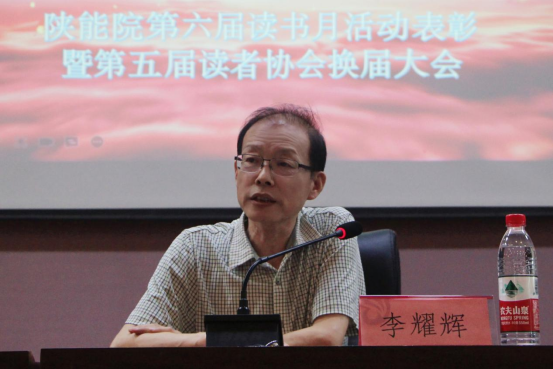 李耀辉在大会上讲话。他对读书月活动的开展情况给予了充分肯定,对师生积极踊跃参与活动表示欣慰,对获奖的师生表示祝贺,对活动的组织者表示感谢。随后,他将自己的读书体会与同学们进行了分享,围绕“中华文化识字始”为主题,深入挖掘汉字背后的文化底蕴和文化传统,从汉字的字形、字音、字意出发,为读协学子详细的介绍了读书与识字的价值和意义。指出,文以载道,字以载文;汉字传承着中华民族的文化基因,汉字的诞生,让中华民族凝魂聚神;有了汉字,才有了辉煌璀璨的唐诗宋词元曲汉文章,才有了汪洋恣肆的书法艺术;中国汉字博大精深、底蕴丰厚,通过读书和识字,我们可以了解天地之间的道理,可以获得与人相处的技巧,可以培养精益求精的精神;书是有思想的文字,读书是文明传承之途、社会进步之力、水平提升之路、人生成长之梯、青年成才之要、国家立足之根。他表示,本届读书月活动虽已结束,但希望同学们能将读书变成生活的一部分,形成一种习惯。他用“书自香我,技能惠人”八个字鼓励大家多读书。读书可以明理增智,读书可以提升修养,读书可以淬炼灵魂;读书可以养心,读书可以养生,读书可以养神;读书不仅影响到个人,还能影响到他人,乃至于整个民族、整个社会。书是浓缩的人生,书是知识的精华,书是前人的经验,他希望大家养成多读书、读好书、善读书的习惯,使读书内化于心、外化于行,终身与书相伴,从书籍中汲取文化养份和精神力量,希望同学们通过读书,萌养文化自信,拓宽人生深度和广度;坚持独立思考,与实践相结合,学有所悟,用有所得,在学习和实践中领悟真谛。