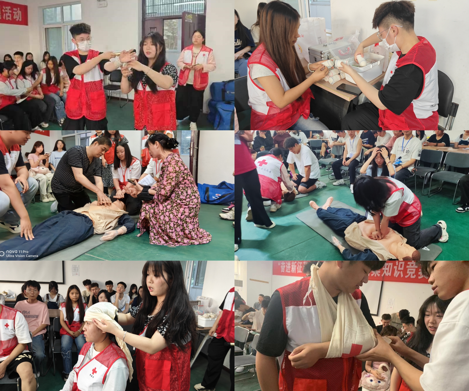 活动中,红十字会优秀会员王欣灿、王博雅等人为师生讲解心脏复苏、止血、包扎、固定等急救方法,并为师生能够更好学习掌握,进行现场实践操作。同学们积极参与互动,在红十字会会员的专业指导下,大家掌握了心脏复苏的正确操作流程,以及有效的止血、伤口包扎等急救方式。