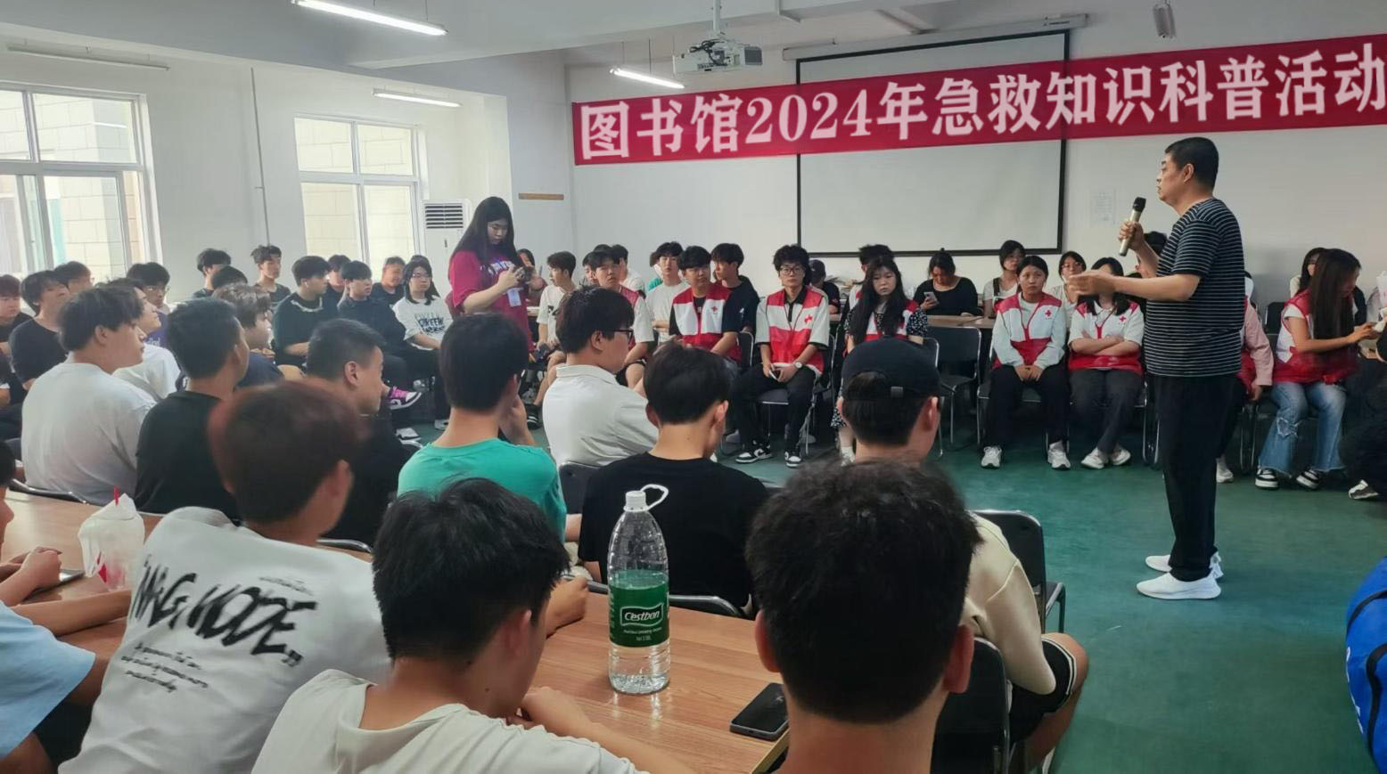 5月21日晚,图书馆在我校活动中心二楼自习室举行急救知识科普活动。活动由图书馆李贺、王卫红老师主持,组织读者协会、红十字会、建测学院共120余人参加。