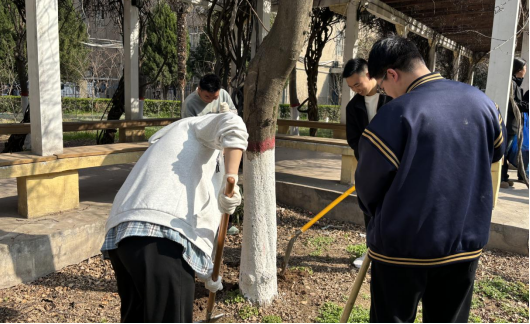 翠薇园里,师生们分工协作、默契配合,有的挥锹松土,有的俯身擦拭,有的精心创作,欢声笑语回荡在绿植带与花园间。阳光透过枝叶洒落,斑驳光影中,大家的身影与绿植融为一体,汗水浸湿衣衫,却挡不住脸上洋溢的满足与喜悦。