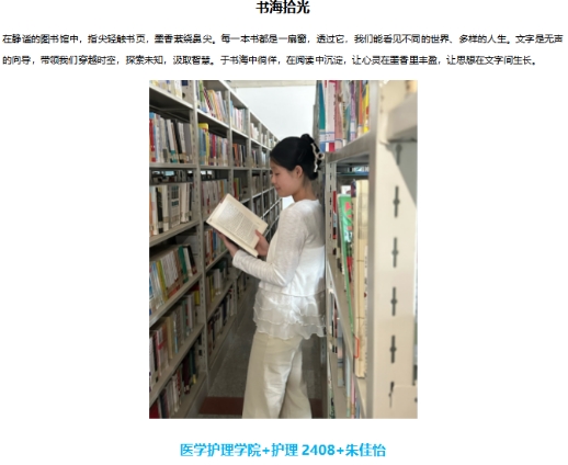 获奖作品均以温情的视角,勾勒出人与书籍的浪漫邂逅,定格了读者与书本相伴的美好瞬间,既展现了青春学子沉浸阅读的专注姿态,更传递出阅读赋予心灵的丰盈与力量。读书明理增智,修身润心致远。此次“墨韵书香影藏情”最美阅读瞬间摄影大赛,不仅为同学们提供了展示自我、交流学习的平台,呈现了一场精彩的视觉盛宴,更推动了书香文化的传递与推广,进一步激发了全校师生的阅读热情,让浓厚的书香氛围在校园中悄然蔓延,为建设书香校园注入新的活力。