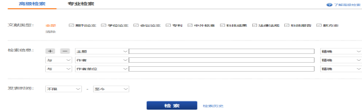 高级检索中包含跨库检索和专业检索两种方式,其中专业检索适于专业信息人员使用。高级检索如图2.1-2所示,分为检索区、文献类型选择区和检索历史区。