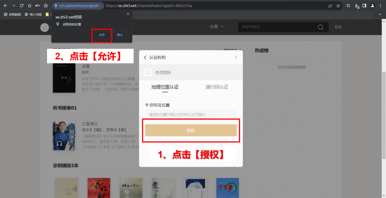 点击【授权】,点击【允许】获取您的位置,即可开启阅读之旅~