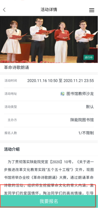 第四步,点击“我要报名”,报名表应填写学院、专业、班级、姓名、学号、手机号。
