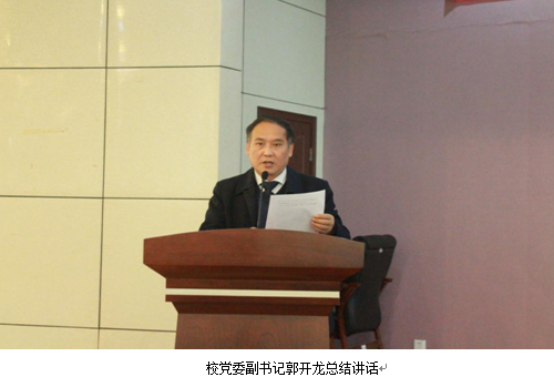 最后,党委副书记郭开龙代表学院对暑期社会实践工作所取得的丰硕成果表示肯定。我校连续2年荣获团省委、省教育厅等6部门联合评定的全省高校暑期社会实践“示范学校”(全省唯一一所高职院校),3支团队荣获省级“优秀团队”,2位同志荣获省级“先进个人”;我校暑期脱贫攻坚活动荣获省委高教工委评定的全省高校脱贫攻坚专项行动“先进集体”;一个团队项目荣获团中央2017大中专学生社会实践“千校千项”成果遴选活动“最具影响好项目”。诸多成绩的取得,得益于学校的高度重视、团委的精心组织和科学谋划、各部门大致支持和配合、全体实践师生的扎实努力和忘我服务。本次社会实践活动,得到了上级领导、实践单位、社会的高度评价和充分肯定,取得了良好的社会效益。同时,郭书记从“开展特色,务求实效;巩固宣传,扩大影响;谋划长远,形成机制”三个方面对今后的社会实践工作提出新的要求,希望有更多的师生加入社会实践活动,不断探索创新,将自己无限的才华和热情投入到形式多样的社会实践中去,在社会实践中锻炼接受锻炼、实现价值,共同创造社会实践工作新的辉煌。