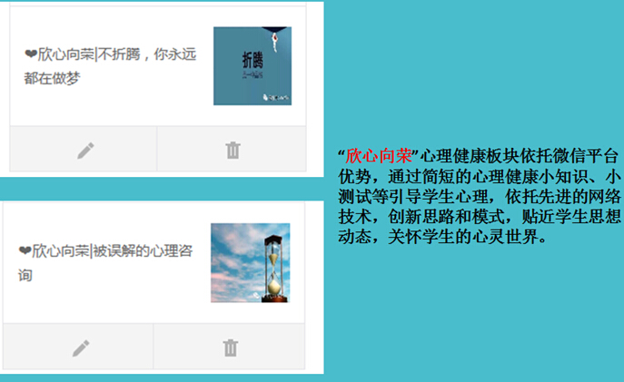 ——微信公众平台心理栏目”欣心向荣”。利用团委微信平台,每天推送“欣心向荣”心灵成长、励志关爱、心理常识等方面的文章,多渠道多层次开展线上心理交流活动。