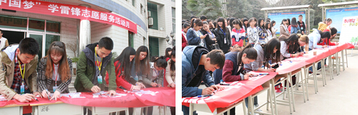 下午4点,在《学习雷锋好榜样》熟悉的歌声中,雷锋月启动仪式暨签名大会准时开始。活动由院团委胡媛媛老师主持,胡老师介绍到,今年是毛泽东同志题词“向雷锋同志学习” 52周年,院团委结合实际下发了《关于开展“志愿服务耀三秦、青春共筑中国梦”学雷锋志愿服务活动月活动的通知》,根据通知要求,临潼校区团委根据实际情况提出了16项学雷锋活动计划,临潼校区各系团总支也根据实际陆续开展相应活动。