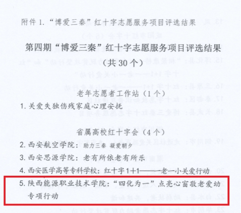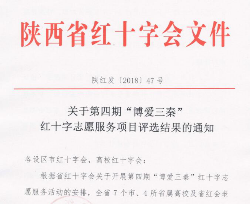 近日陕西省红十字会发文《关于第四期“博爱三秦”红十字志愿服务项目评选结果的通知》(陕红发〔2018〕47号)的通报,我校申报的《“四化为一”点亮心窗敬老爱幼专项行动》项目成功入选,(该项目为全省高校唯一入选的高职院校)并将获得项目资助,助力项目顺利完成。