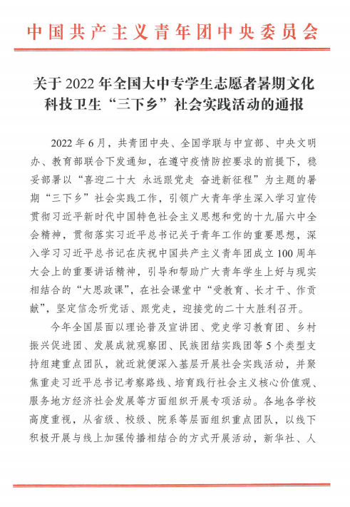 去年,我校跻身暑期“三下乡”社会实践“全国优秀单位”,在此基础上,今年继续带领全校团干部深入研究、开拓创新,严抓前期培训、中期监管和后期总结,在团队参与、宣传报道、基地建设、服务好评等方面再创新高,调研方法和调研报告质量明显提升,创新创业成果转化有重大进展,理论研究成果实现零的突破……积极创新工作方式、确保工作实效,引导和帮助广大青年学生上好与现实结合的“大思政课”,在社会课堂中“受教育、长才干、做贡献”,坚定信念听党话、跟党走,用实际行动迎接党的二十大胜利召开。