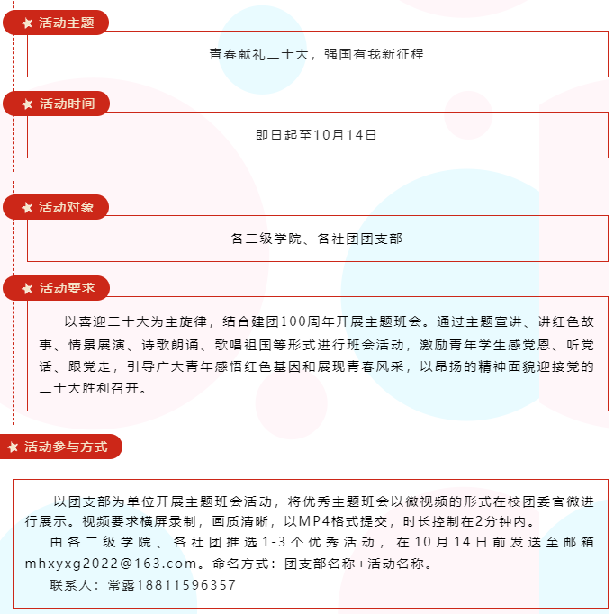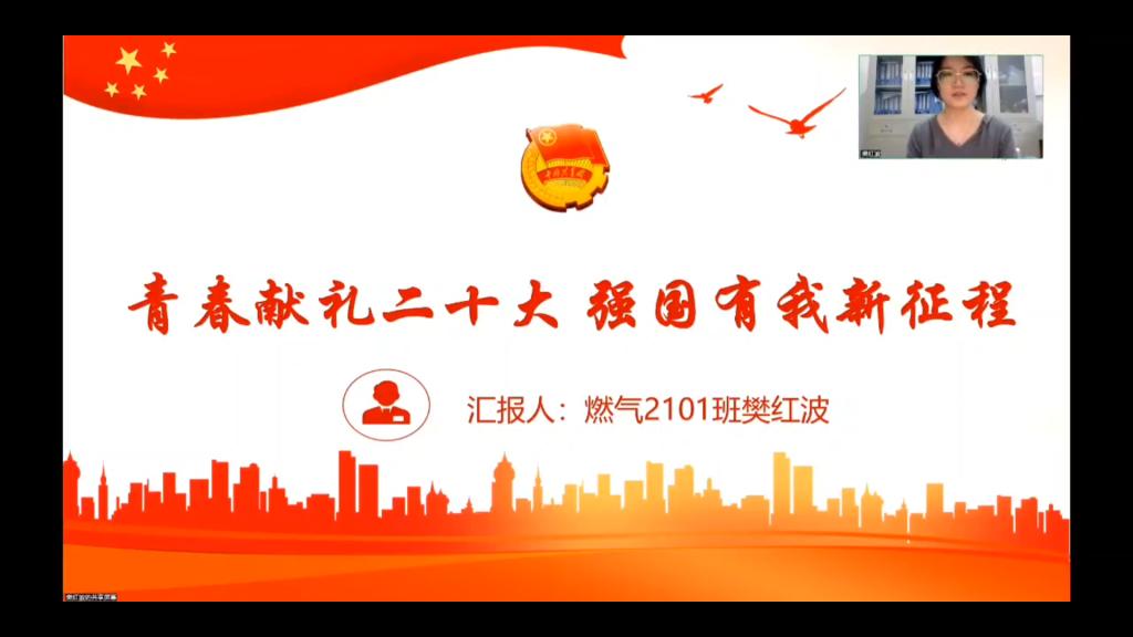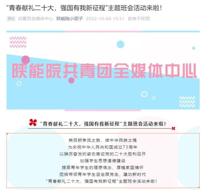 在全校各团支部开展“青春献礼二十大 强国有我新征程”主题班会活动。通过主题宣讲、讲红色故事、情景展演、诗歌朗诵、歌唱祖国等形式进行,激励青年学生感党恩、听党话、跟党走,引导广大青年感感悟红色基因和展现青春风采。