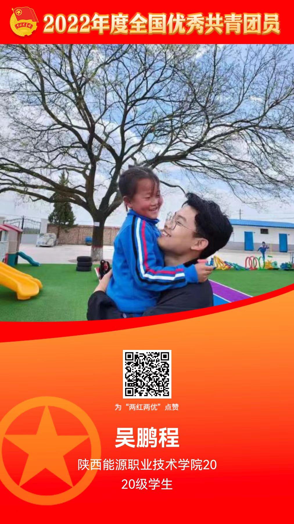 吴鹏程,20级学生,2015年加入中国共产主义青年团,曾荣获国家励志奖学金。作为一名团员,他认真执行团组织的指示和决议,围绕建设服务型青年组织开展一系列活动。带领团员青年向先进学习,并充分发挥青年生力军和突击队作用。模范履行团员义务,践行社会主义核心价值体系。勤于学习,甘于奉献,其积极参加乡村振兴,关爱留守儿童等志愿活动。保持着奋斗与担当的青春本色,坚决做好党的助手和后备军。
