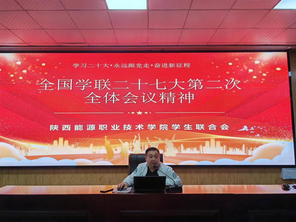为深入学习宣传贯彻党的二十大精神,传达学习全国学生联合会第二十七届委员会第二次全体会议成果,团结带领广大同学学习党的二十大精神、坚定跟党走、奋进新征程,5月29日下午,陕西能源职业技术学院学生会组织学生骨干认真学习会议精神,并结合学习内容分享各自的心得体会。会议由校团委社团管理部主任陈杰主持,各学院学生会主席团成员及学生骨干代表150人出席参加此次学习会。