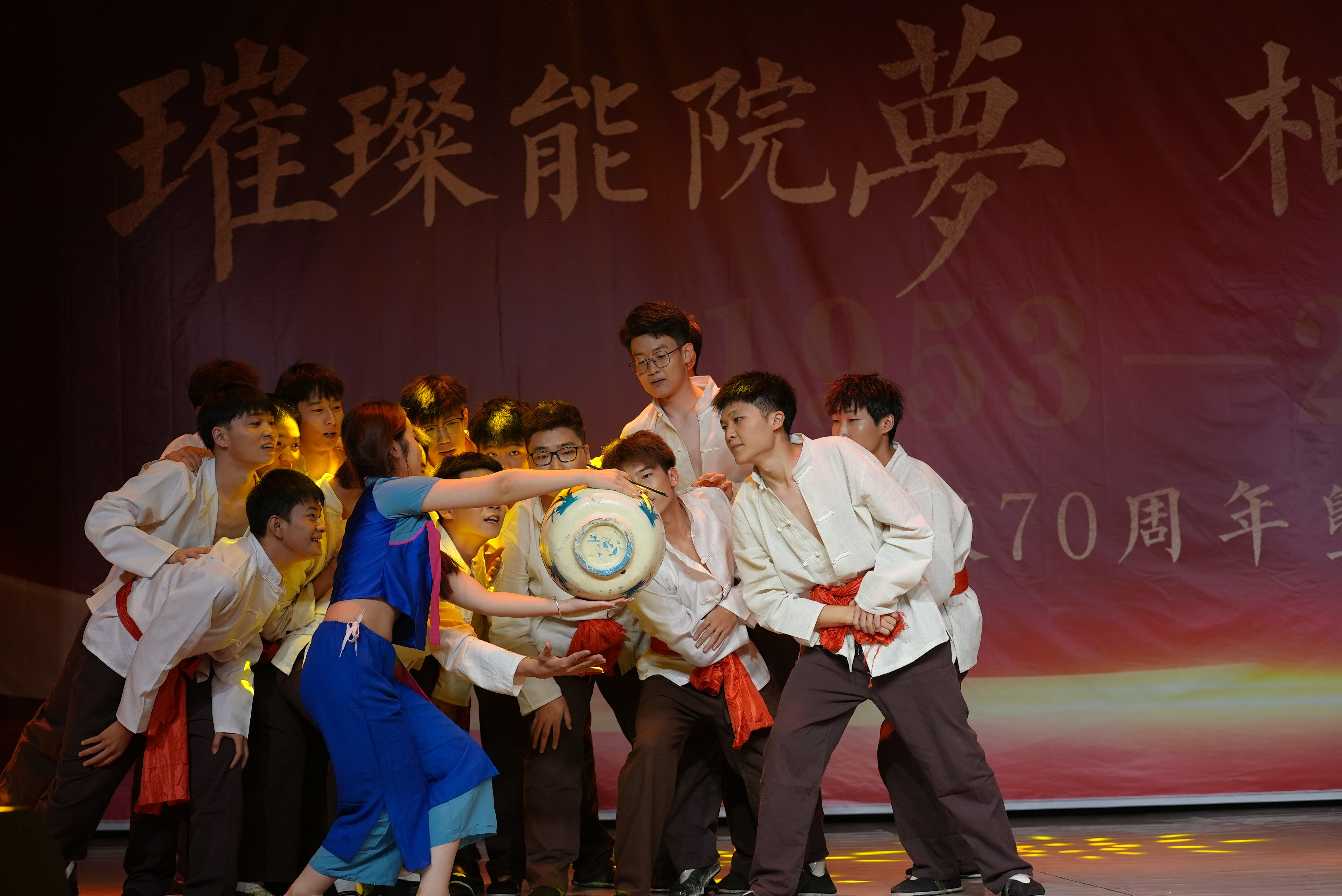 晚会开始前,在全场的欢呼声中,校旗以及8个二级学院院旗从观众席四周簇拥奔向主席台,挥舞的一面面旗帜伴着观众的阵阵呐喊声,晚会在热烈的氛围中拉开了序幕。整场晚会分为“源”、“缘”、“园”、“圆”四个篇章,以历史发展为脉络围绕学校七十年发展历程,以歌舞、朗诵、情景剧等表现形式,展现一代代能院人栉风沐雨、薪火相传的奋斗史,不断传承发扬“拼搏奉献 求实创新”的太阳石精神。